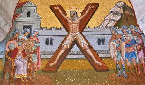 Pedeapsa pe care a primit-o Sf. Andrei a fost moartea prin răstignire, dar, potrivit tradiției, a considerat că este nedemn să fie răstignit la fel ca Domnul Dumnezeul său, astfel încât el a implorat să i se facă o cruce de forma diferită. Așa s-a ajuns să fie răstignit pe o cruce în forma de X. Sfântul Andrei a fost răstignit, în orașul Patras, lângă Corint, pe o cruce în forma de X (Crux decussata), căreia i s-a spus „Crucea Sfântului Andrei”