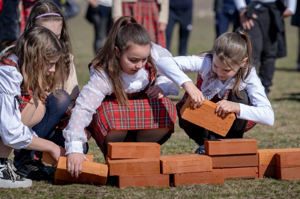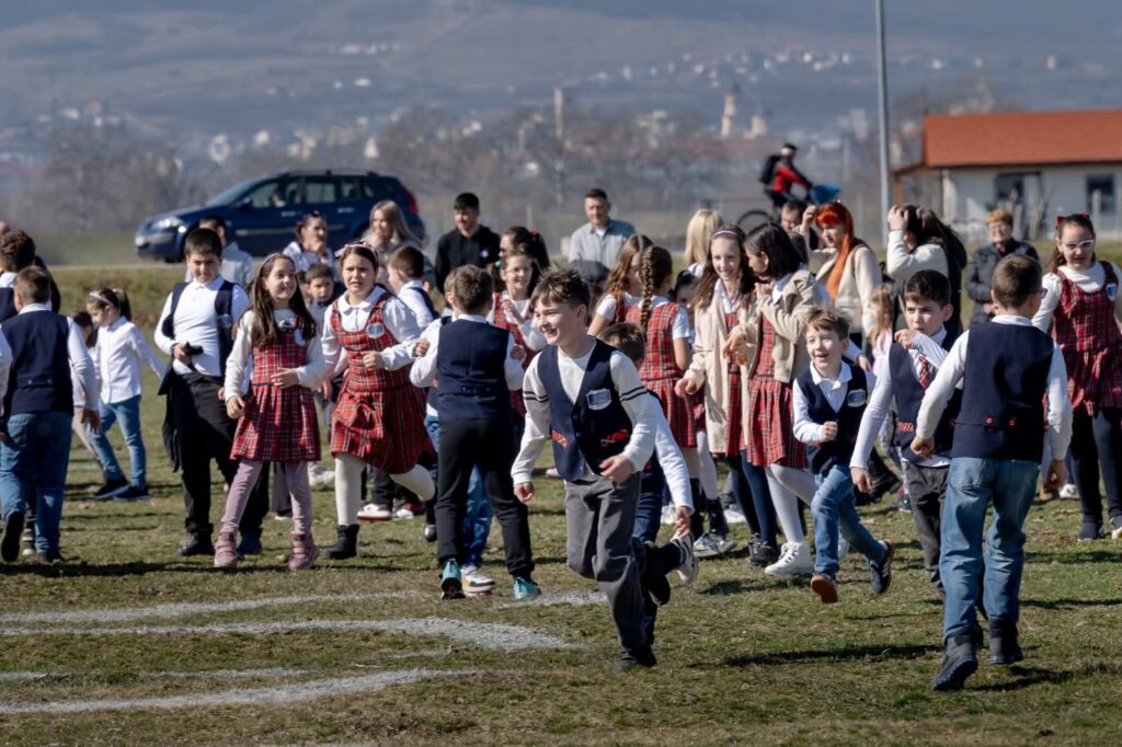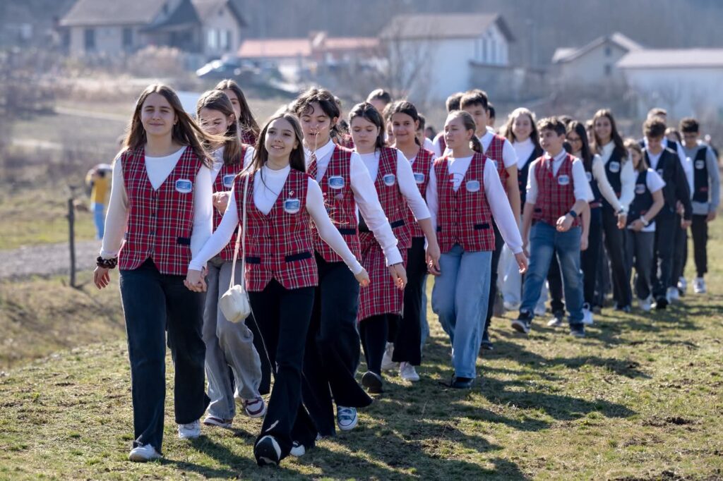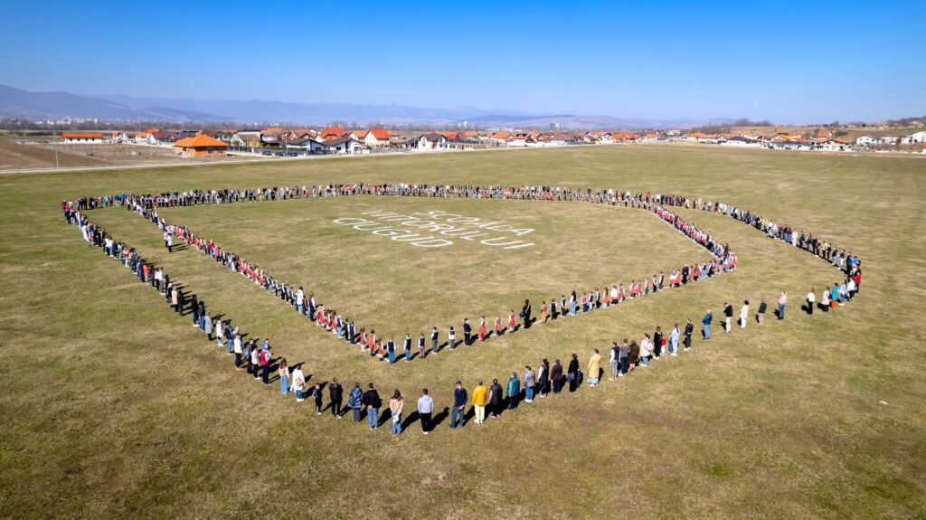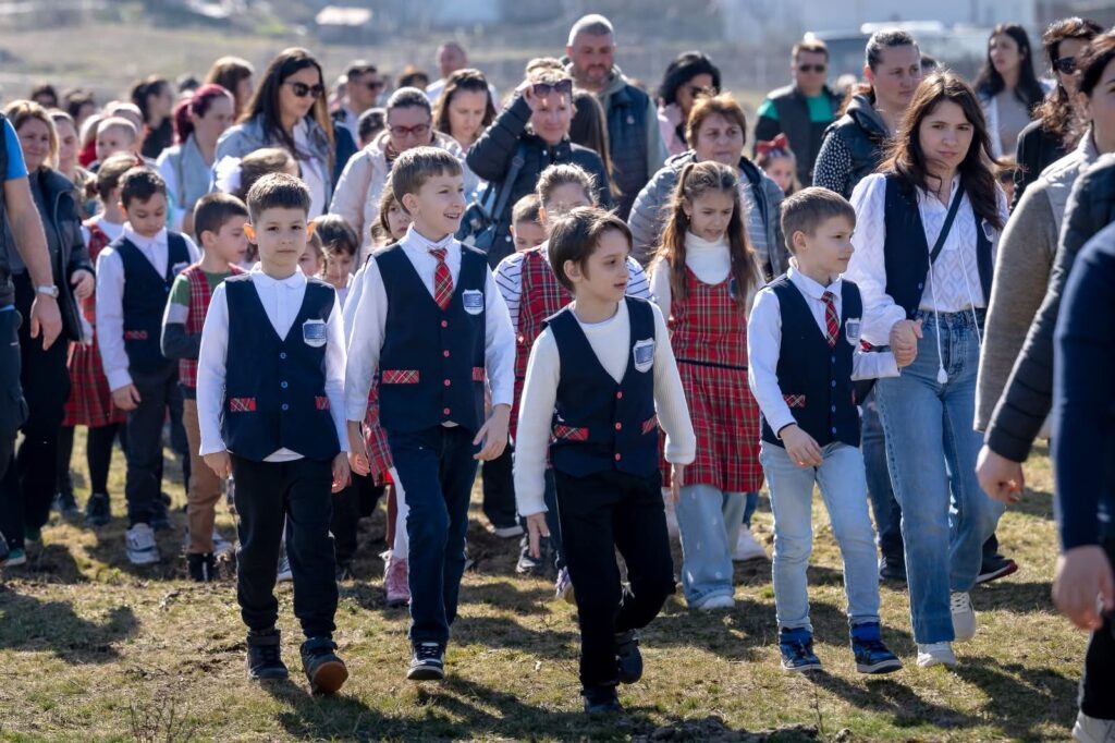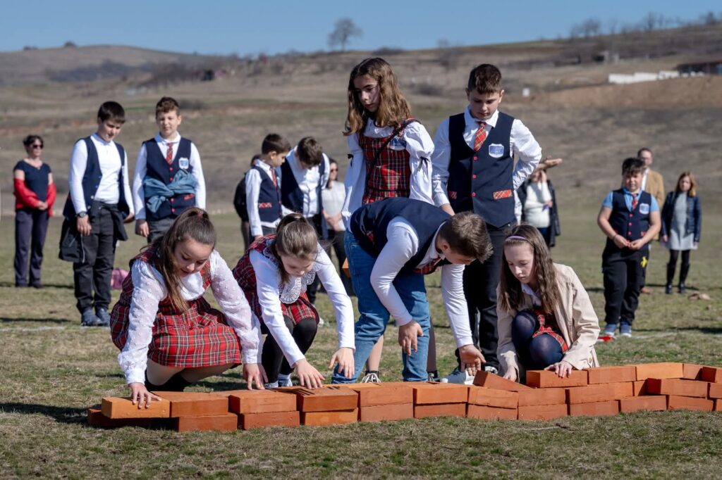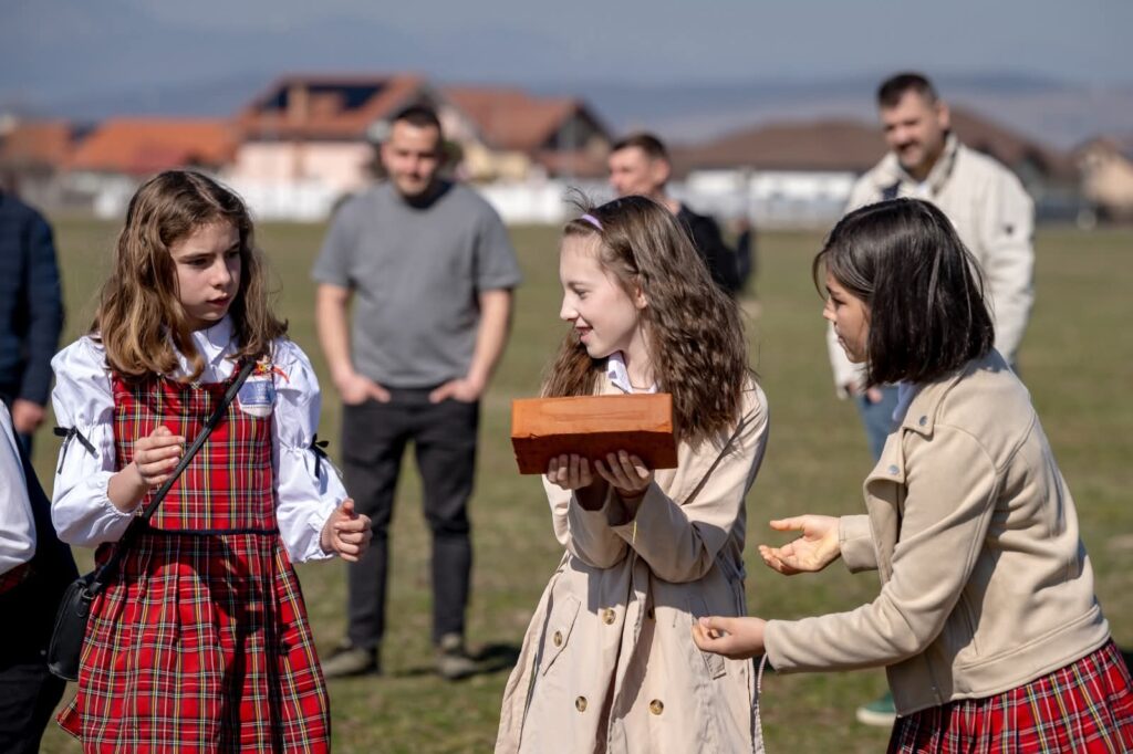 Participanții s-au adunat pe pășunea din centrul comunei, un spațiu de 15 hectare pe care va fi construit un complex educațional și sportiv: școală, bază sportivă, sală de sport, bazin de înot și un parc cu arbori autohtoni. Cu toții au îmbrățișat simbolic conturul clădirii, iar copiii au clădit un zid din cărămizi, acestea urmând să se regăsească în zidurile viitoarei școli.