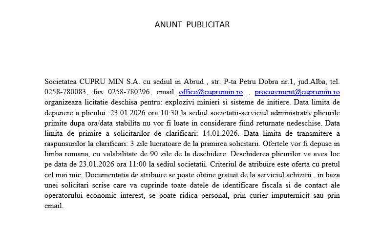 Societatea CUPRU MIN S.A. cu sediul in Abrud , str. P-ta Petru Dobra nr.1, jud.Alba, tel. 0258-780083, fax 0258-780296, email office@cuprumin.ro , procurement@cuprumin.ro organizeaza licitatie deschisa pentru: explozivi minieri si sisteme de initiere. Data limita de depunere a plicului :23.01.2026 ora 10:30 la sediul societatii-serviciul administrativ,plicurile primite dupa ora/data stabilita nu vor fi luate in considerare fiind returnate nedeschise. Data limita de primire a solicitarilor de clarificari: 14.01.2026. Data limita de transmitere a raspunsurilor la clarificari: 3 zile lucratoare de la primirea solicitarii. Ofertele vor fi depuse in limba romana, cu valabilitate de 90 zile de la deschidere. Deschiderea plicurilor va avea loc pe data de 23.01.2026 ora 11:00 la sediul societatii. Criteriul de atribuire este oferta cu pretul cel mai mic. Documentatia de atribuire se poate obtine gratuit de la serviciul achizitii , in baza unei solicitari scrise care va cuprinde toate datele de identificare fiscala si de contact ale operatorului economic interest, se poate ridica personal, prin curier imputernicit sau prin email.