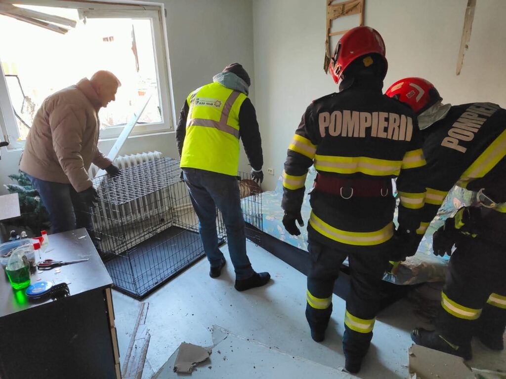 În haosul lăsat de explozie, salvatorii au găsit un suflet nevinovat: cățelul proprietarului, cu arsuri superficiale în zona capului, speriat și vulnerabil, ascuns după o canapea.