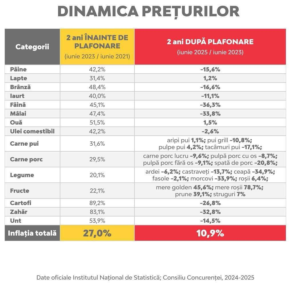 Datele oficiale arată efectele pozitive ale plafonării prețului la alimente, la 2 ani de la introducerea acestei măsuri. Făina este mai ieftină cu 36%, mălaiul cu 34%, zahărul cu 33%, brânza cu 17%, pâinea cu 16%, untul cu 14,5%, legumele cu procente cuprinse între 2% și 35%, iar fructele cu procente cuprinse între 7% și 79%. Prețurile au scăzut și la carnea de pui și porc, conform graficului alăturat.