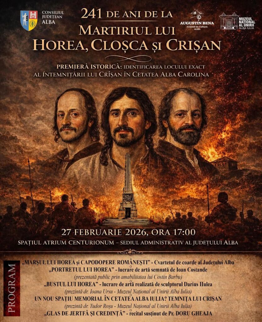 Organizat în Spațiul Atrium Centurionum al Sediului Administrativ al Județului Alba, evenimentul va depăși granița unei simple comemorări, asumându-și dimensiunea unei intervenții culturale cu relevanță istoriografică.Cu această ocazie, 𝐦𝐚𝐧𝐢𝐟𝐞𝐬𝐭𝐚𝐫𝐞𝐚 𝐯𝐚 𝐚𝐝𝐮𝐜𝐞 i𝐧 𝐩𝐫𝐢𝐦-𝐩𝐥𝐚𝐧 𝐨 𝐩𝐫𝐞𝐦𝐢𝐞𝐫a 𝐢𝐬𝐭𝐨𝐫𝐢𝐜a, o contribuție documentară semnificativă, consolidând cercetarea istorică locală și oferind publicului o perspectivă clară asupra unuia dintre episoadele decisive ale Răscoalei din 1784: 𝐢𝐝𝐞𝐧𝐭𝐢𝐟𝐢𝐜𝐚𝐫𝐞𝐚 𝐥𝐨𝐜𝐮𝐥𝐮𝐢 𝐞𝐱𝐚𝐜𝐭 𝐚𝐥 î𝐧𝐭𝐞𝐦𝐧𝐢ță𝐫𝐢𝐢 𝐥𝐮𝐢 𝐂𝐫𝐢ș𝐚𝐧 î𝐧 𝐂𝐞𝐭𝐚𝐭𝐞𝐚 𝐀𝐥𝐛𝐚 𝐂𝐚𝐫𝐨𝐥𝐢𝐧𝐚.