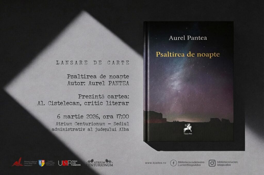Vineri, 6 martie 2026, de la ora 17:00, sala „Atrium Centurionum” de la sediul administrativ al județului Alba va găzdui lansarea volumului de poezie „Psaltirea de noapte” al poetului albaiulian Aurel Pantea.